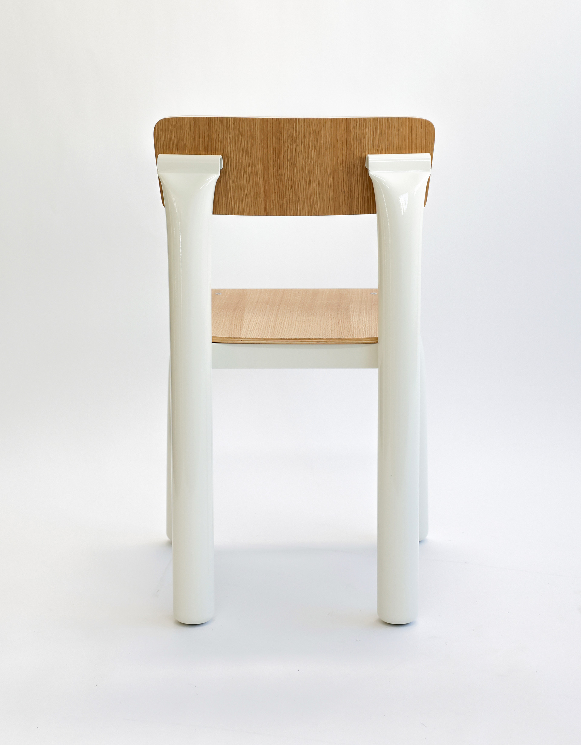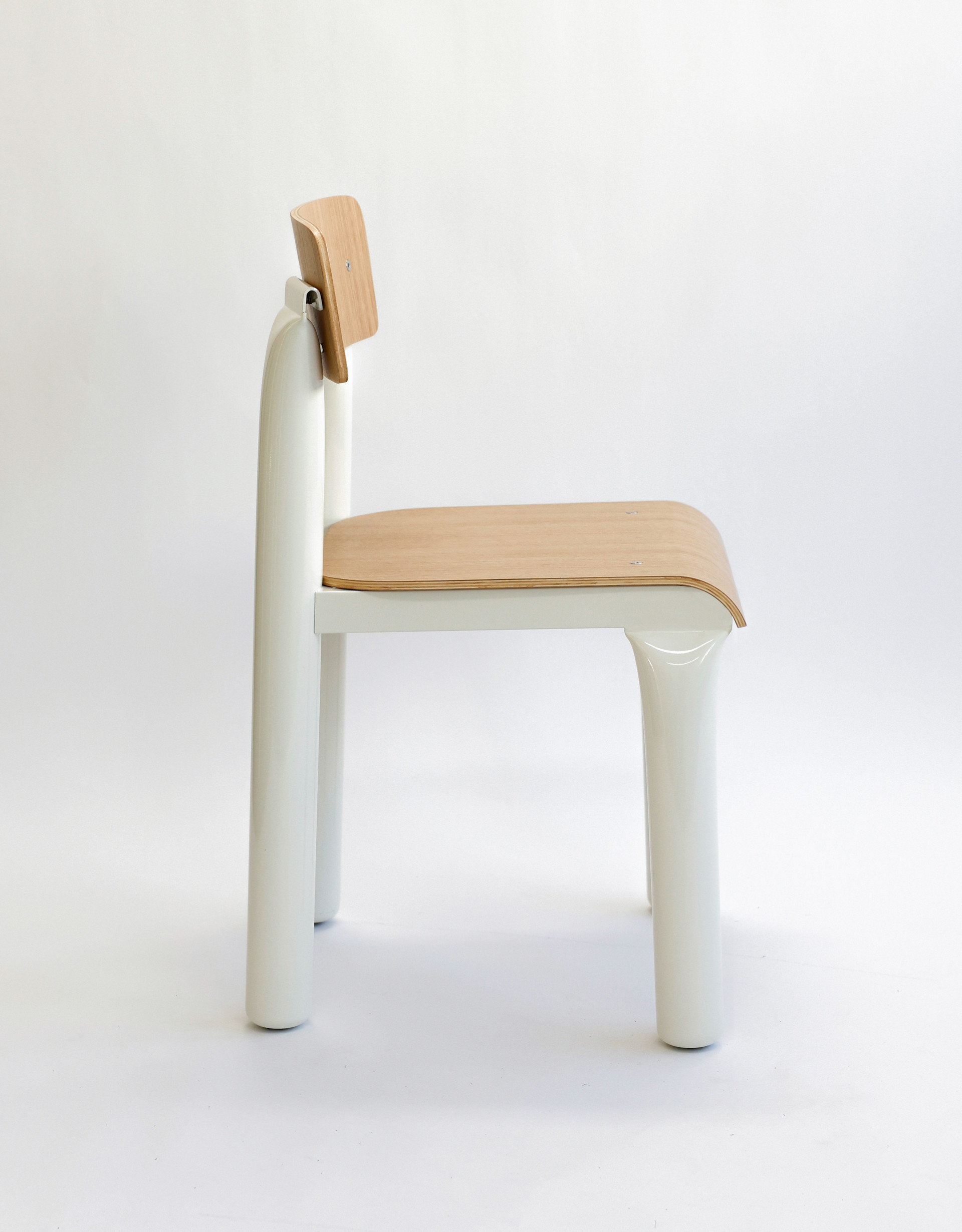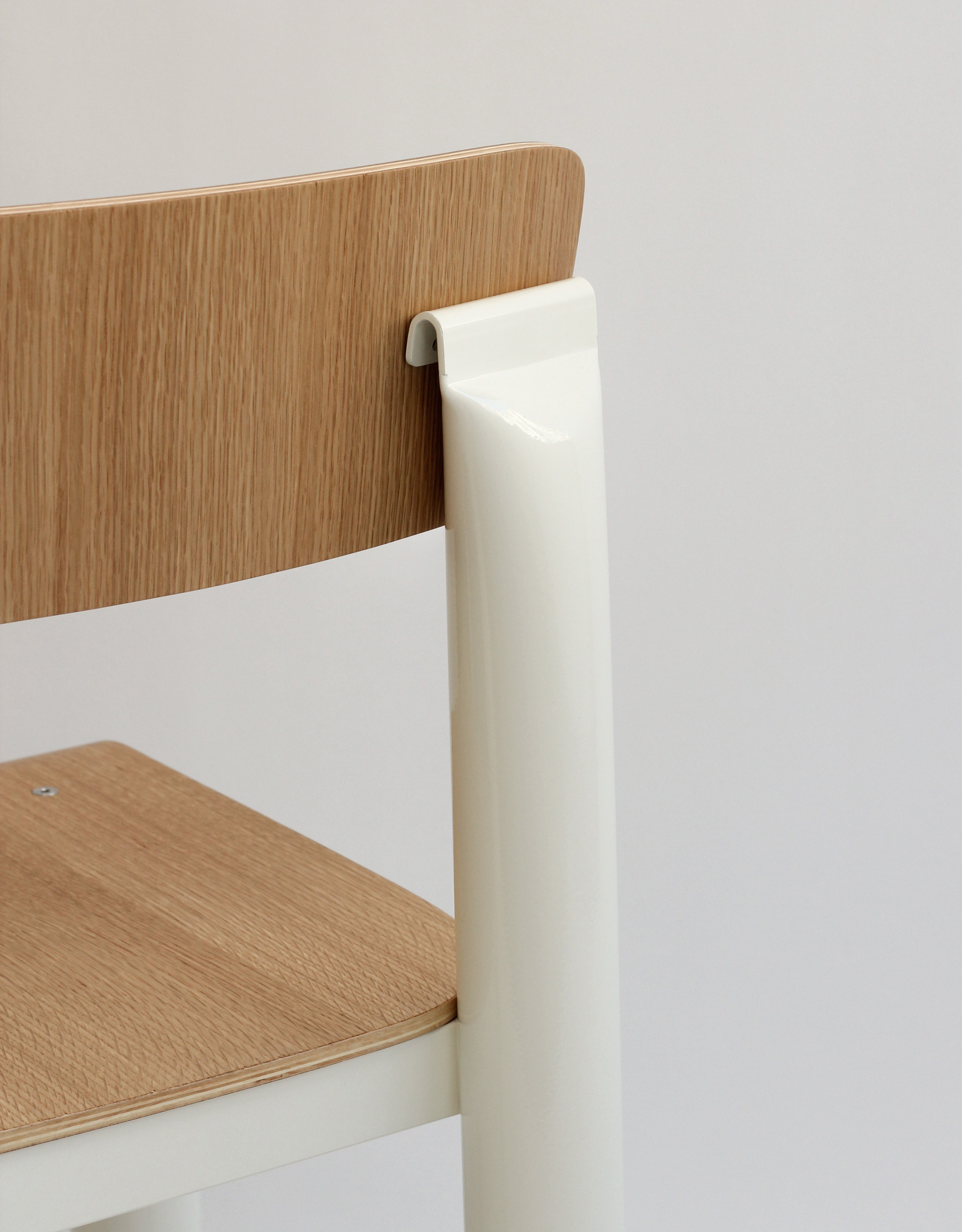유광의 크림 컬러 프레임과 매트한 오크 베니어 합판의 조합은 소재와 색감의 대비가 너무 강하지 않고 배경과 어우러지기 좋은 옵션으로, 나무의 소재감이 강조되는 의자가 필요할 때 사용하기 좋습니다.