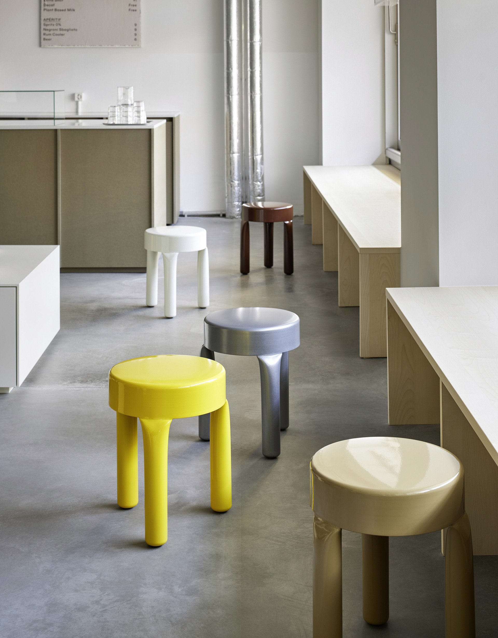 프레수라 스툴은 파이프를 압착하여 만들어지는 자연스러운 표현에 주목한 디자인입니다. 속이 빈 금속 파이프를 압착하는 방식은 금속 작업자들이 금속 구조물의 효율적인 제작을 위해 종종 사용하는 테크닉입니다. 파이프의 압착을 통해 자연스럽게 만들어지는 표현을 더욱 강조하기 위해서 일반적인 것 보다 큰 직경의 파이프를 사용했습니다. 압착된 부분을 좌판과 다리의 연결 부위로 사용하였는데, 이 연결부위는 물건에 독특하고 고유한 특징을 부여합니다.